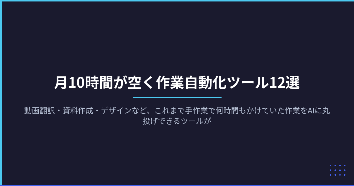 動画翻訳・資料作成・デザインなど、これまで手作業で何時間もかけていた作業をAIに丸投げできるツールが増えています。副業や業務で使える自動化ツール12選を、実際の削減時間とともに紹介します。