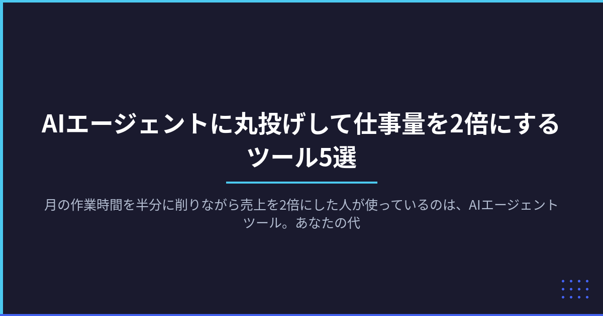 月の作業時間を半分に削りながら売上を2倍にした人が使っているのは、AIエージェントツール。あなたの代わりに働き続けるエージェントの選び方と、今日から始められる5つのツールを具体的に紹介します。