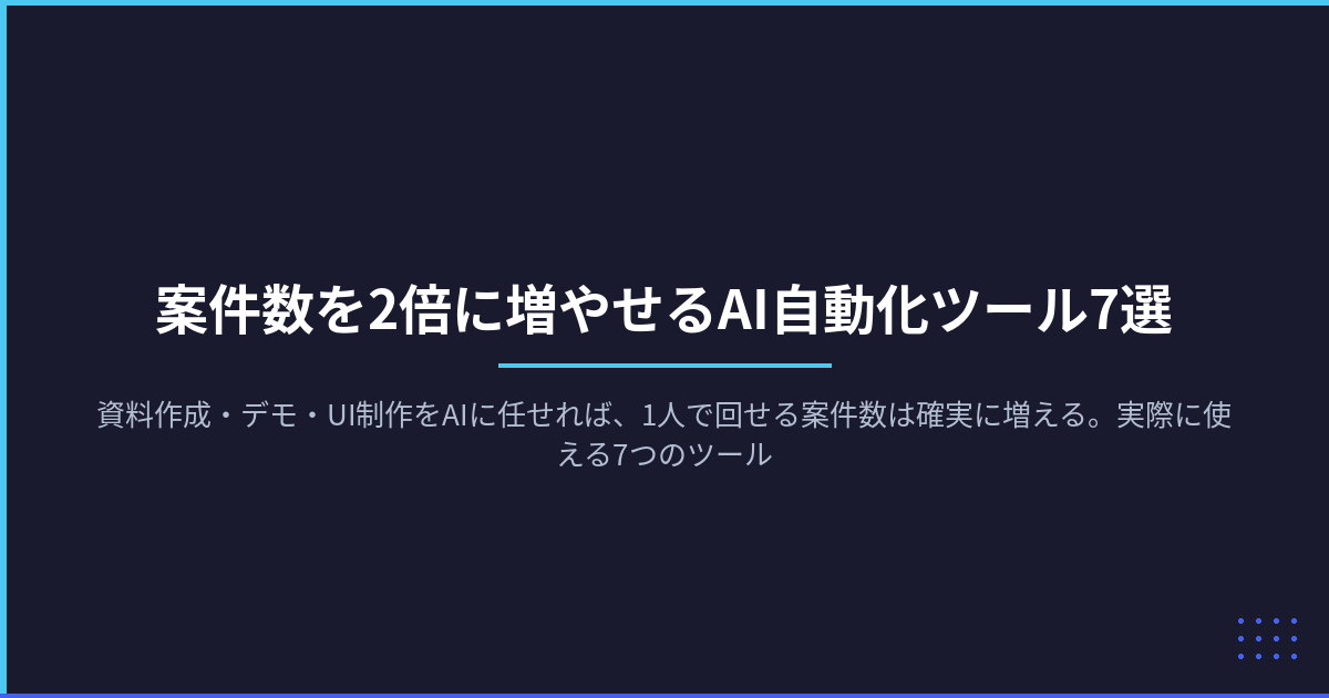 資料作成・デモ・UI制作をAIに任せれば、1人で回せる案件数は確実に増える。実際に使える7つのツールと、どの工程を任せるべきかを具体的に解説。今日から始められる効率化の全手順を公開。