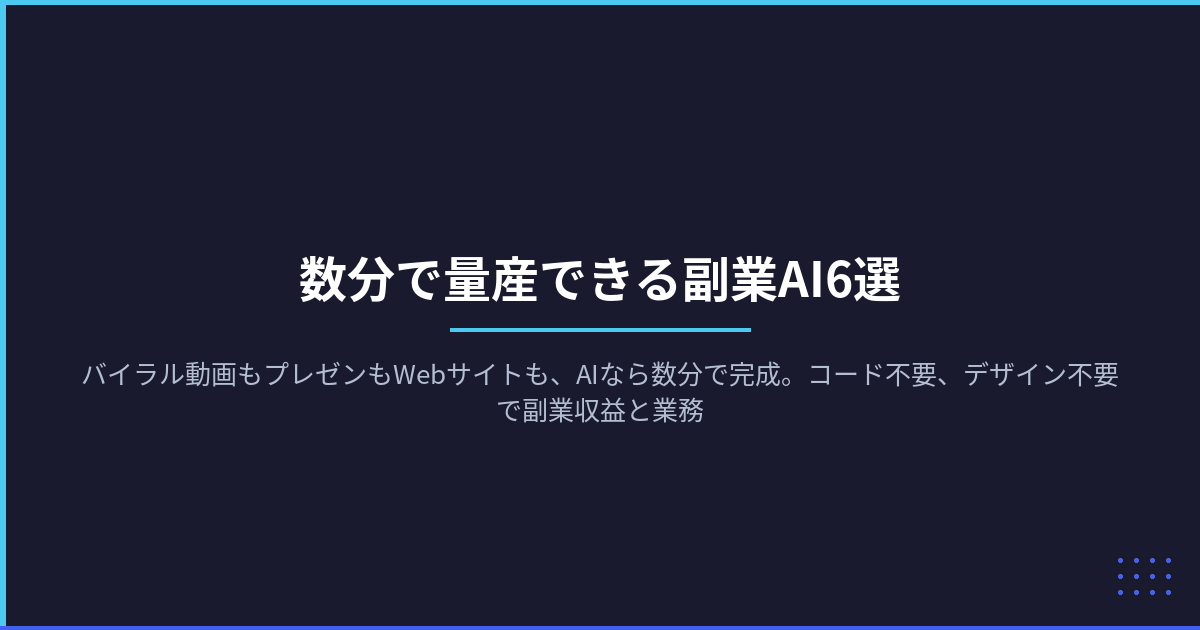 バイラル動画もプレゼンもWebサイトも、AIなら数分で完成。コード不要、デザイン不要で副業収益と業務効率を同時に上げるツールを厳選。無料プランから始められる実践法を公開。
