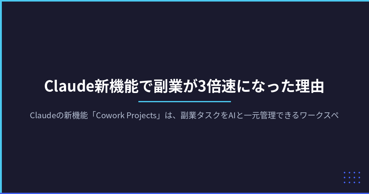 Claudeの新機能「Cowork Projects」は、副業タスクをAIと一元管理できるワークスペースです。案件ごとにファイル・会話・タスクを整理し、作業効率を3倍に高める具体的な使い方を解説します。