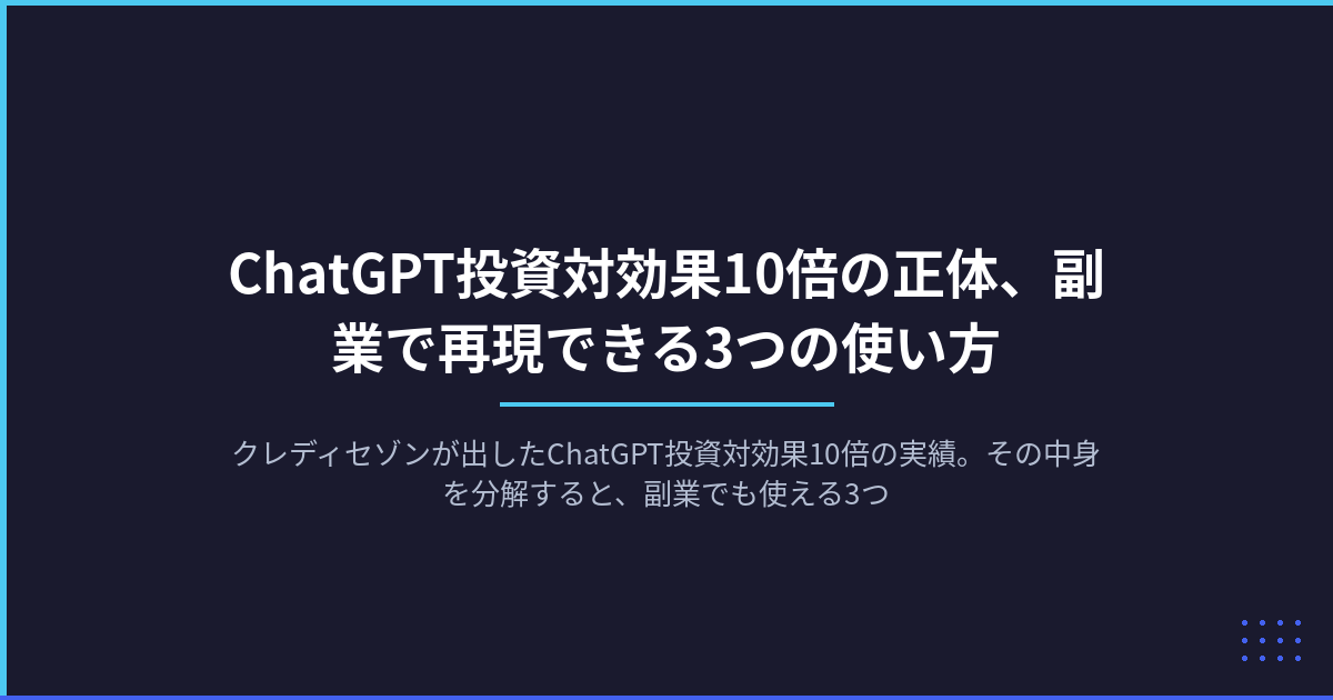 クレディセゾンが出したChatGPT投資対効果10倍の実績。その中身を分解すると、副業でも使える3つの型が見えてきた。特別なスキル不要で今日から始められる具体的な活用法を、大企業の成功事例から逆算して解説する。