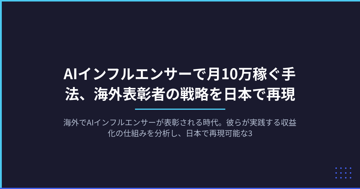 この記事では、海外で表彰されるレベルのAIインフルエンサーが実践する収益化の仕組みを分析し、日本で再現する具体的な手法を示します。顔出し不要、初期投資ゼロから始められる方法です。